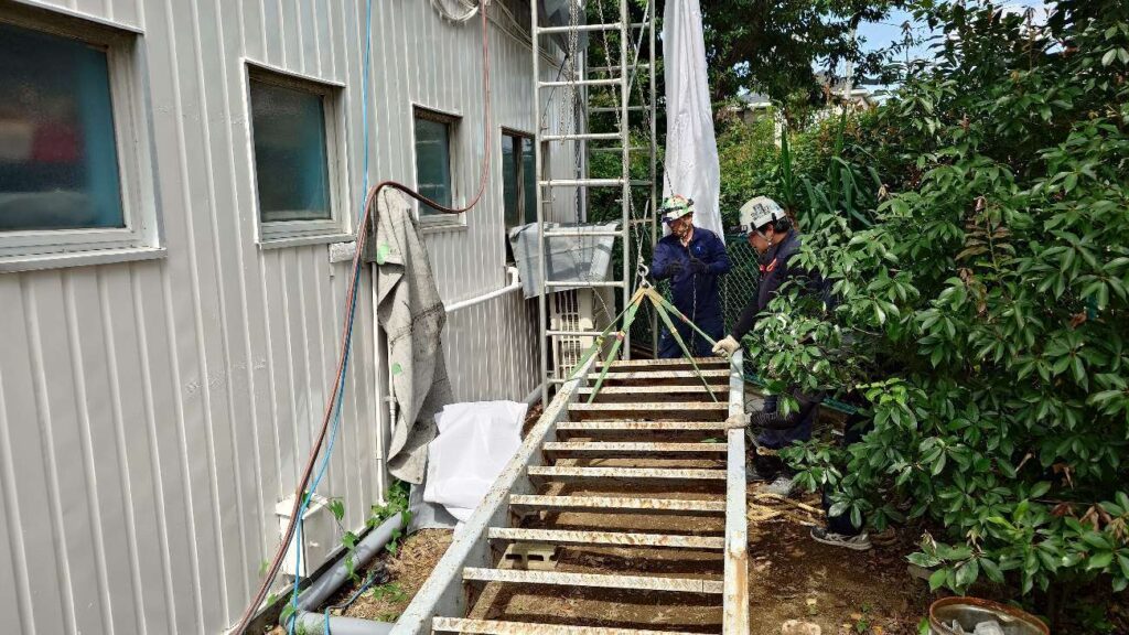 ガス溶接でカットして、手すりも順番に解体し、鉄骨階段も解体しました。