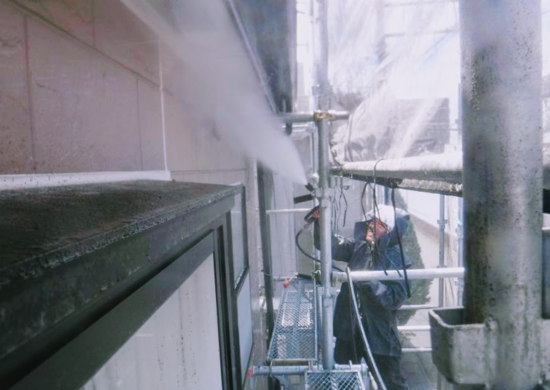 足場設置後、外壁や屋根の高圧洗浄を行います。汚れやカビを徹底的に除去し、塗装の密着性を高めます。洗浄作業は入居者様の生活への影響を考慮し、適切な時間帯に実施します。